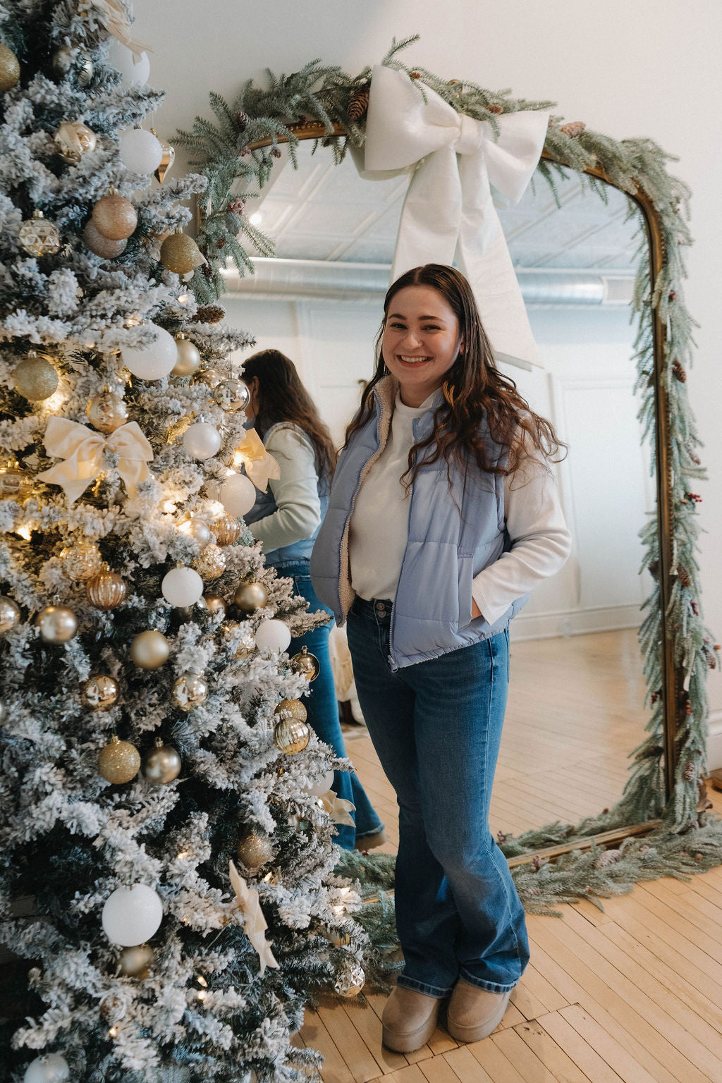 "Stay warm and stylish with the Icy Blue Puff Vest. Featuring a reversible design, this puffer vest is perfect for any winter outfit. Riley, our model, is 5'2 and loves the medium size. Stay cool (literally), Riley!"